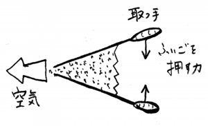 今回はもう少し具体的に筋肉のポンプ作用についてみていきましょう。このポンプの力はもちろん筋肉の収縮力から来ます。ポンプ作用に使われる筋肉は基本的には三角形の形をしています。まず「ふいご」を思い出してください。ふいごといってもわからない方もいるかと思います。左図のように取っ手のついた2枚の板と皮製の蛇腹と風の吹き出すノズルで出来ています。