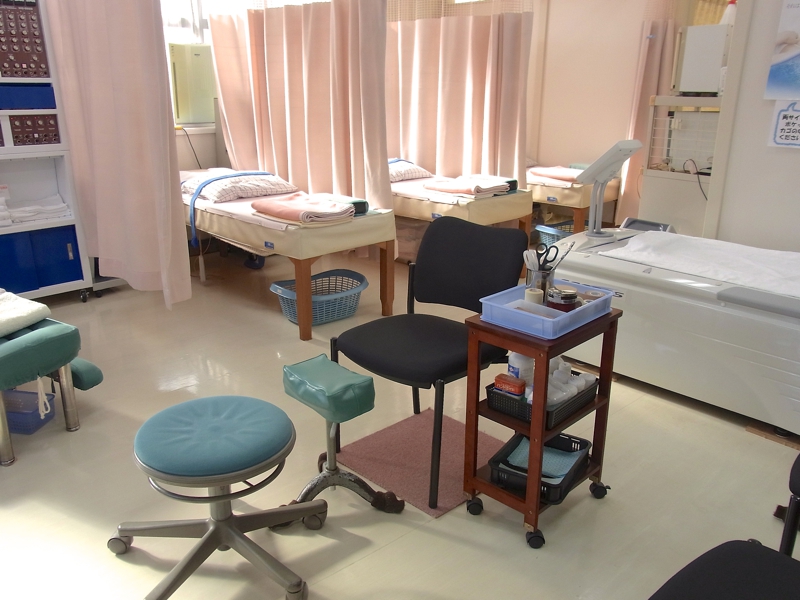 青いベッドではうつ伏せになっていただき、手技療法をいたします。緑のベッドで仙腸関節(骨盤の関節)の調整をいたします。